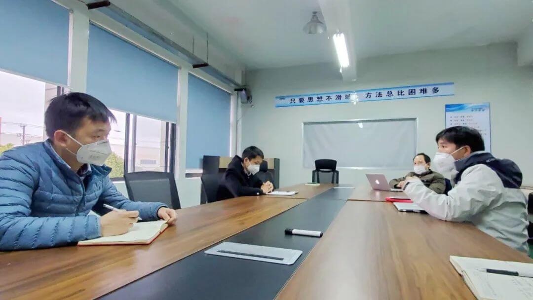 康鸿智能董事长赵国满先生(右1)与技术团队讨论项目