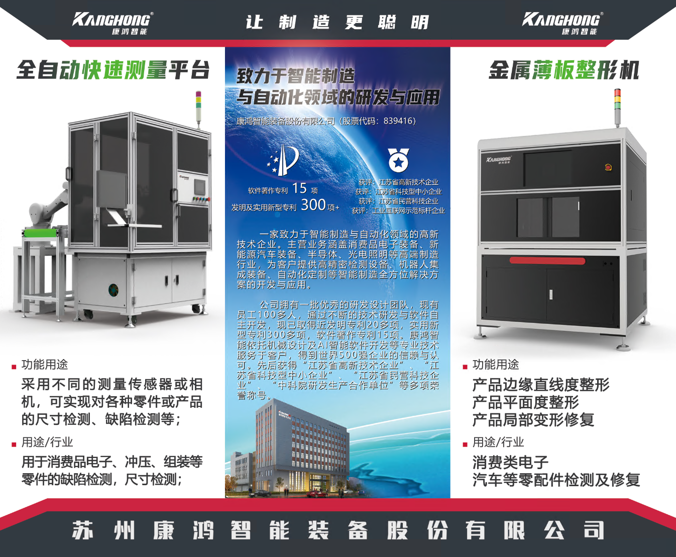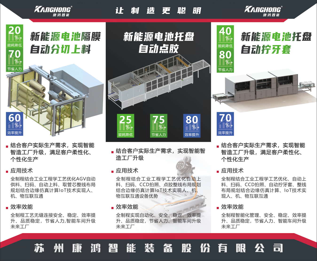 作为国内领先的新能源智能装备供应商,康鸿智能装备业务涵盖3C通讯产品、手机移动终端、TFT液晶玻璃等高端制造行业。为客户提供非标自动化设备、高精密尺寸检测、自动化包装设备、外观检测与修复设备、机器人集成应用及自动化装备,共荣获发明及实用新型专利一百多项。康鸿智能装备积极参加了本次2023世界动力电池大会。展示了各类高性能、高可靠的智能自动化设备,并提供相关的解决方案和服务
