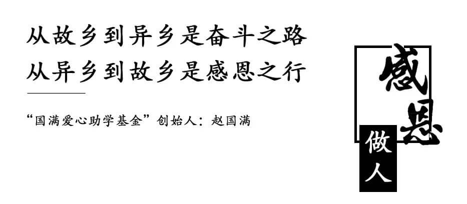 仗义疏财,援莘莘学子梦;慷慨解裹,助济济栋梁材。赵国满先生坚持把企业的发展与社会责任相结合,”国满爱心助学基金” 希望受助学生刻苦学习,立志成才;以宁折不弯的勇气和魄力、以乐观向上的精神风貌和积极心态,自力更生,励志进取。启迪企业要有面向未来的长远目光和正确的价值观,肩负社会责任,感恩做人,敬业做事。